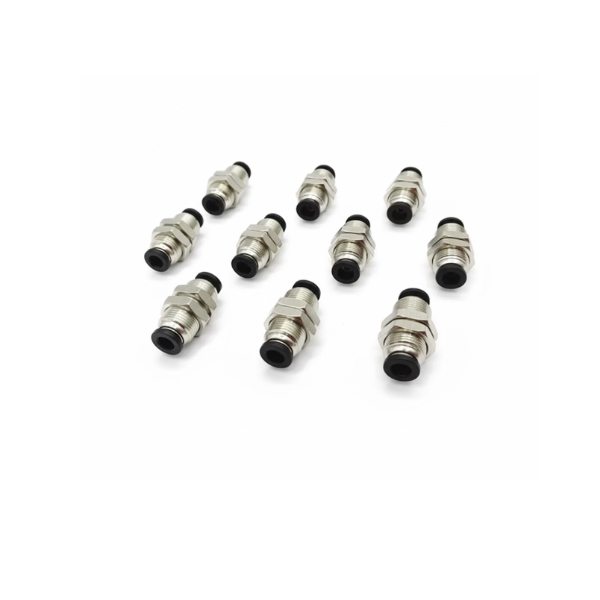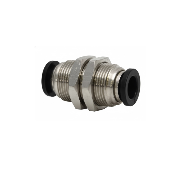 Los accesorios neumáticos conectan secciones de tubería, tubo y manguera en sistemas neumáticos. Los conectores neumáticos pasamuros permiten el paso a través de una partición o panel, conectando dos tubos juntos.